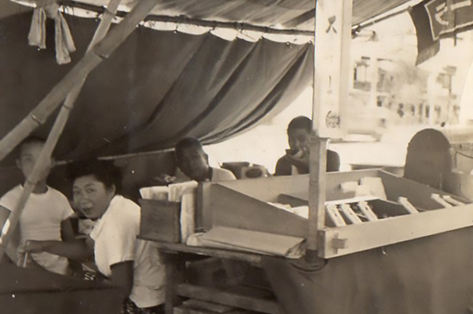 以下は、三宝屋の昭和30年代の写真です。 ベビーカステラ、あんまきなどを製造・販売している様子は今も昔も変わりませんが、服装や髪型などを見ると当時の風景に懐かしさを覚えます。